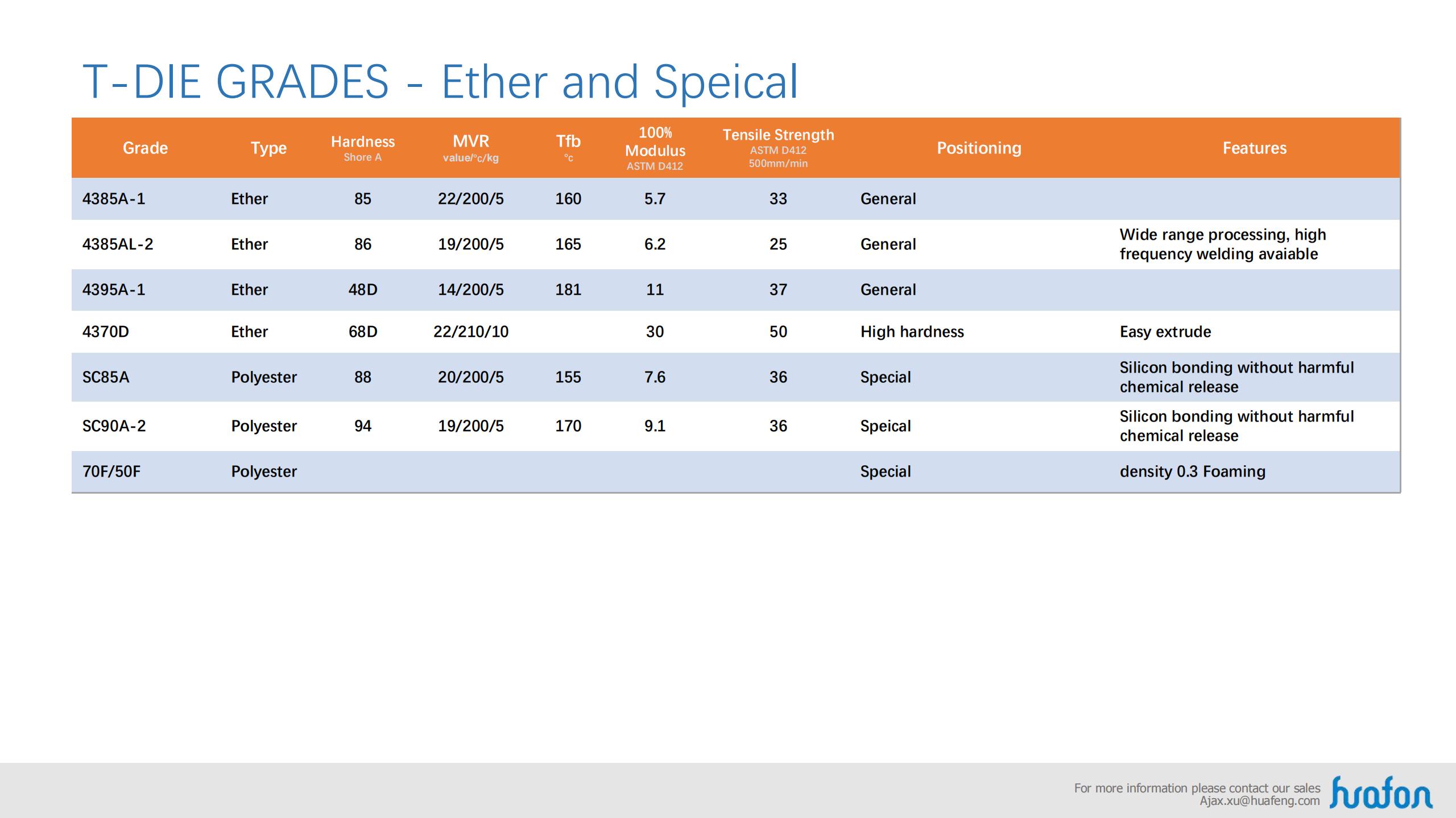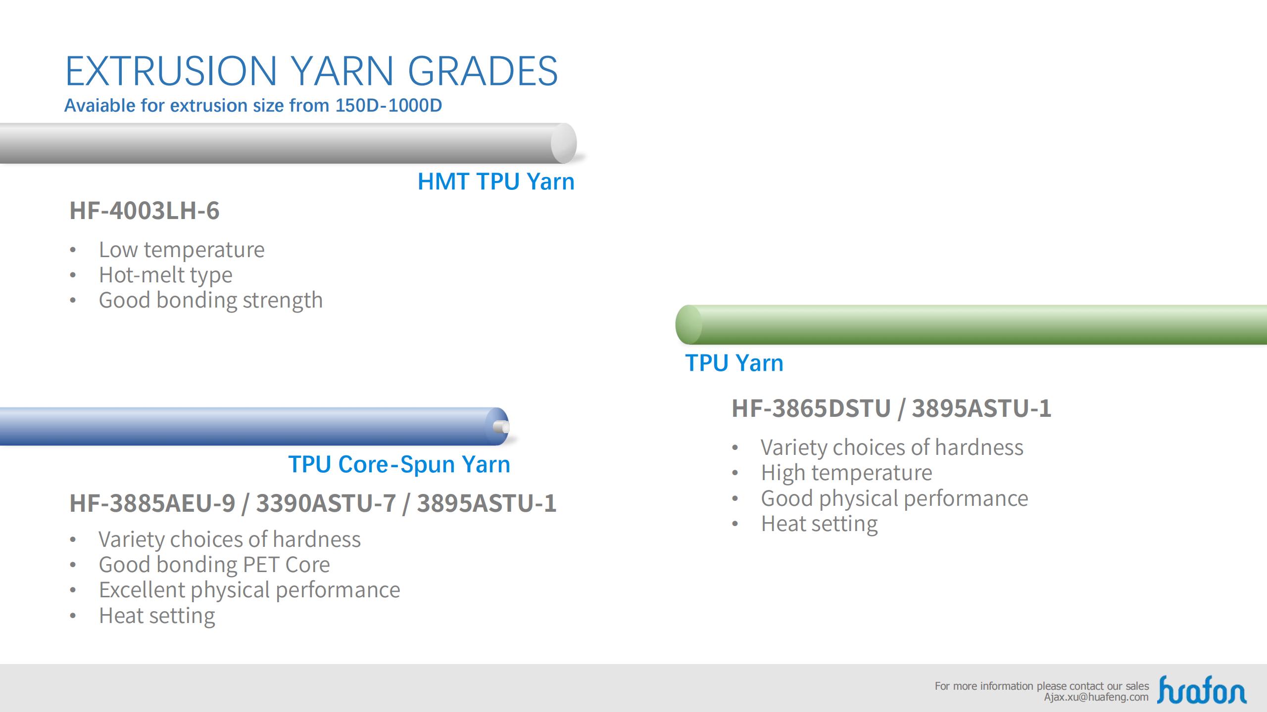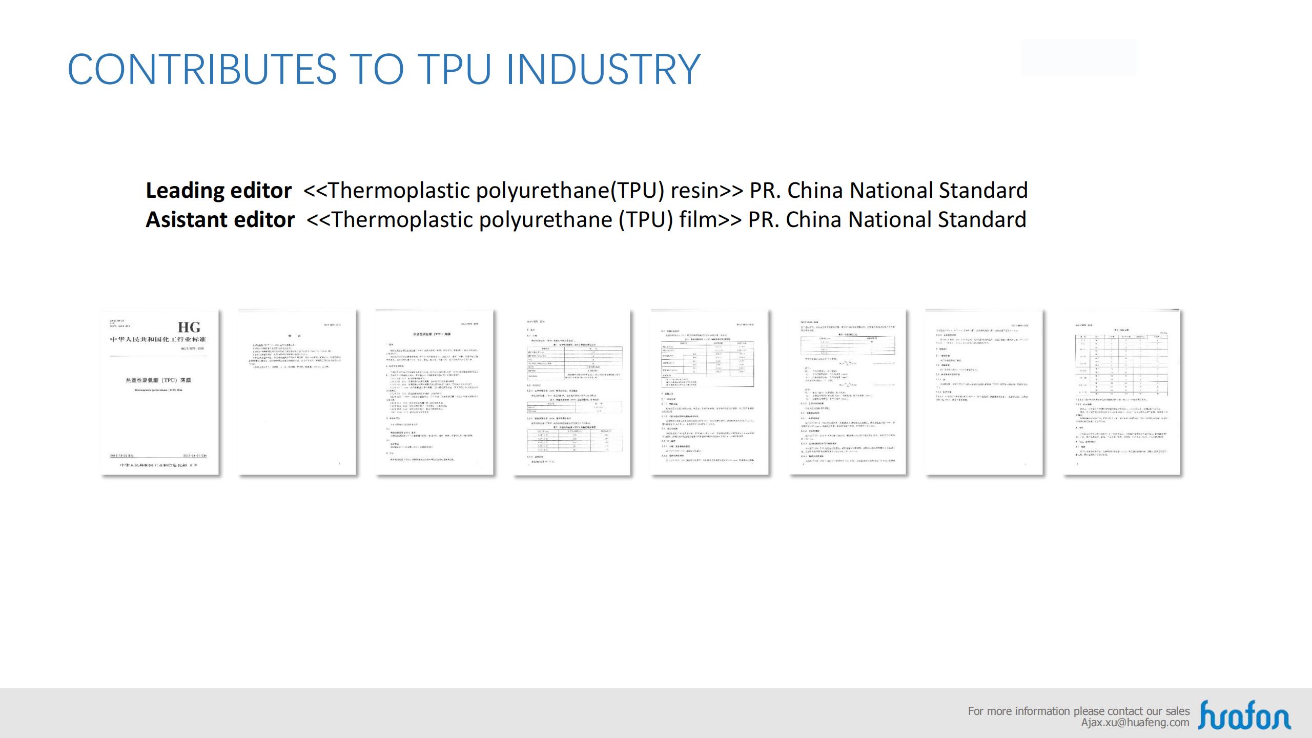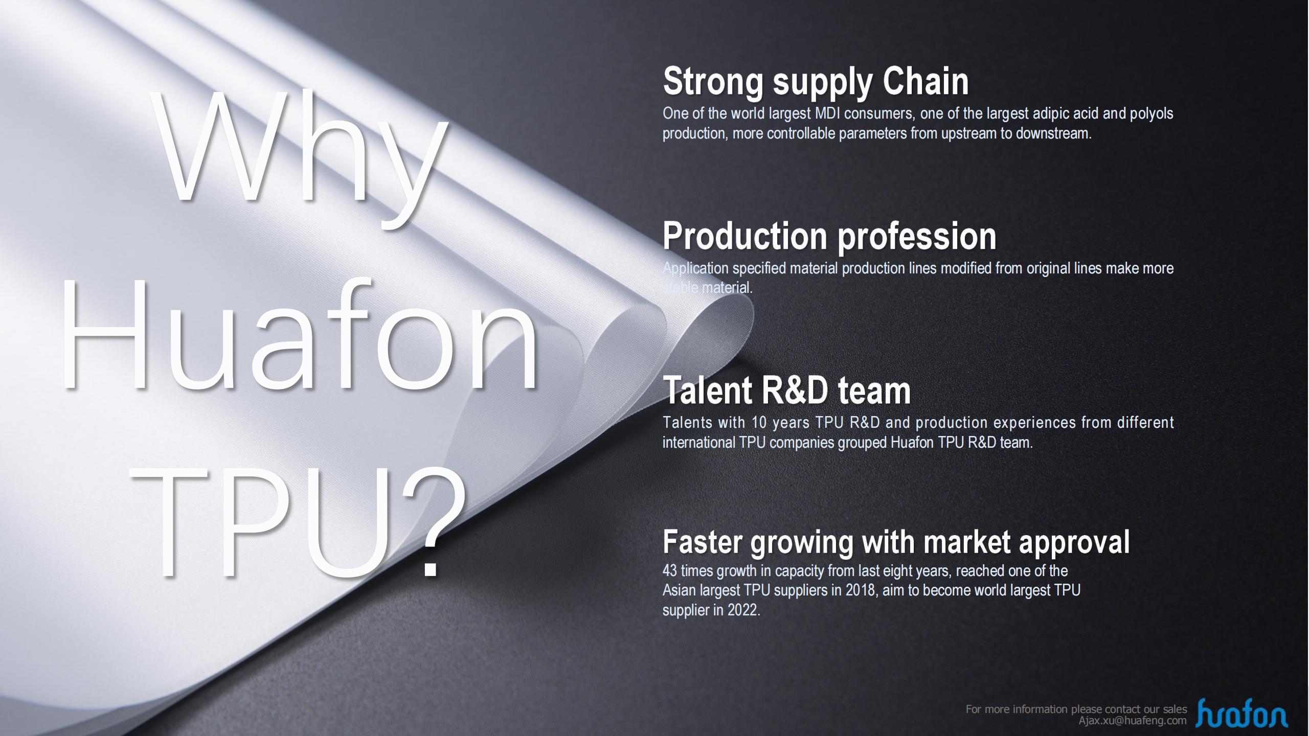 Base on the property of aliphatic series and aromatic series, Huafon TPU can satisfy the consume and industry filed, as well as different requirement and different equipment.
