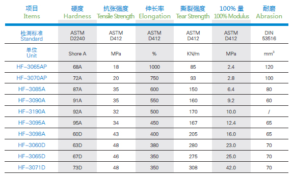Huafon 30/31 series products have Excellent Physical/Mechnical properties and Environmental protection, Good abrasion resistance, High tear strength, Fast de-molding and Great Cold/Heat resistance. It’s mainly used in (Transparent) Footwear, Accessories, Sealing ring, Automotive, Over-molding, Cell-phone cover, Protective gear, Machinery accessories, Compounding, elevator and skateboard wheel.